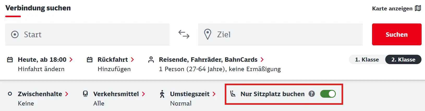Über die Website der Deutschen Bahn können Sitzplatzreservierungen erworben werden. Dazu muss die Option “Nur Sitzplatz buchen” in der Suche ausgewählt werden.